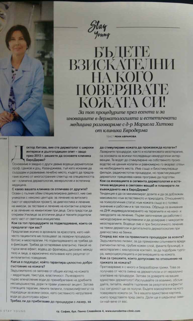 Интервю с д-р Хитова за октомврийския брой на сп Ева в рубриката StayYoung