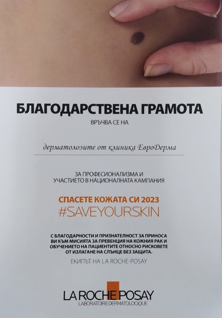 Екипът на Клиника ЕвроДерма получи благодарствена грамота от La Roche-Posay за приноса към мисията за превенция на кожния рак и информираността на пациентите за рисковете от излагане на сльнце без защита!