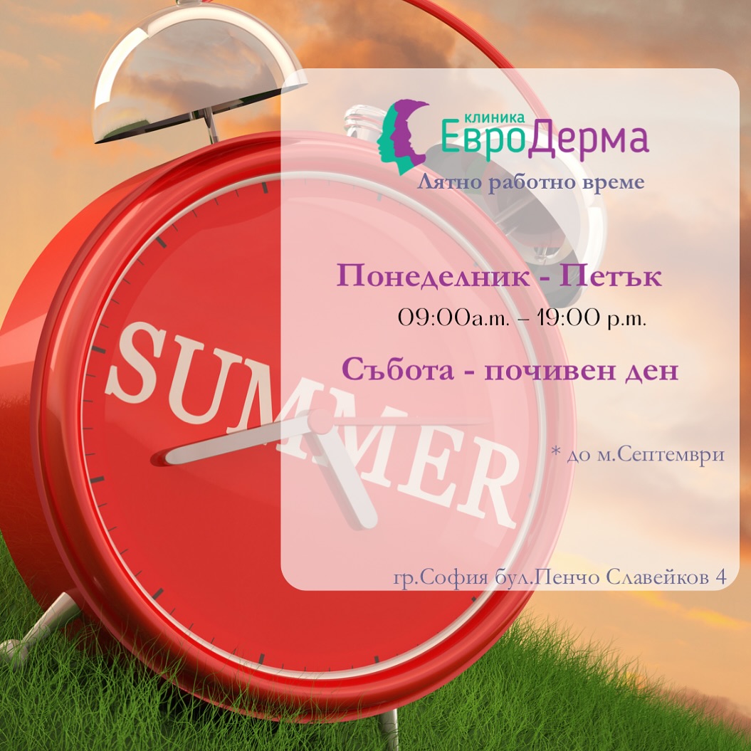 Скъпи пациенти, информираме Ви, че Клиника ЕвроДерма ще работи с лятно работно време до м. Септември:
