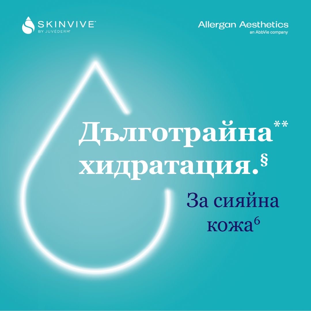 С удоволствие ви представяме най-новия революционен продукт на Allergan – SKINVIVE. Първият и единствен инжекционен бустер за дълготрайна, дълбока хидратация до 9 месеца – само след една процедура.